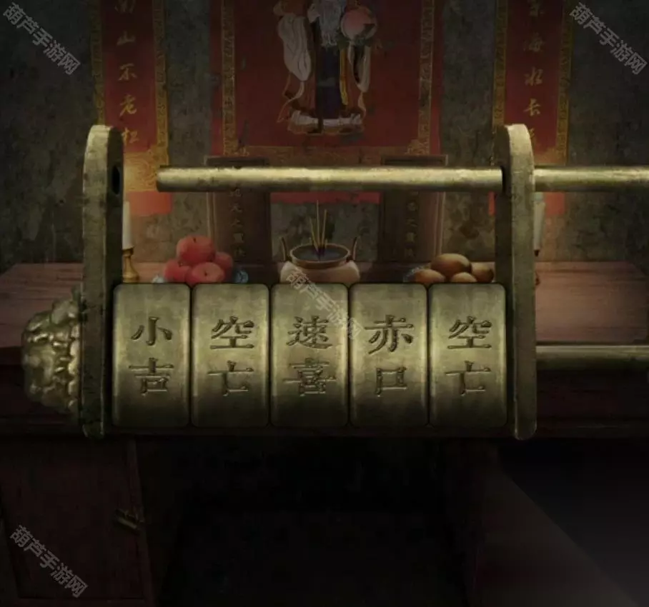 所以最终密码就是小吉、空亡、速喜、赤口、空亡,是不是感觉自己突然能去算一卦了?快克制一下回来继续解谜!调整密码打开左边的柜子拿到一对铜钹,右转给空茶壶加入茶叶和热水获得茶,给客厅中间的桌子上茶杯倒满就能打开卧室门了,右转进入卧室,床旁边拿到一双鞋子,别着急走床下还有个箱子,不过箱子上的密码暂时没有线索。