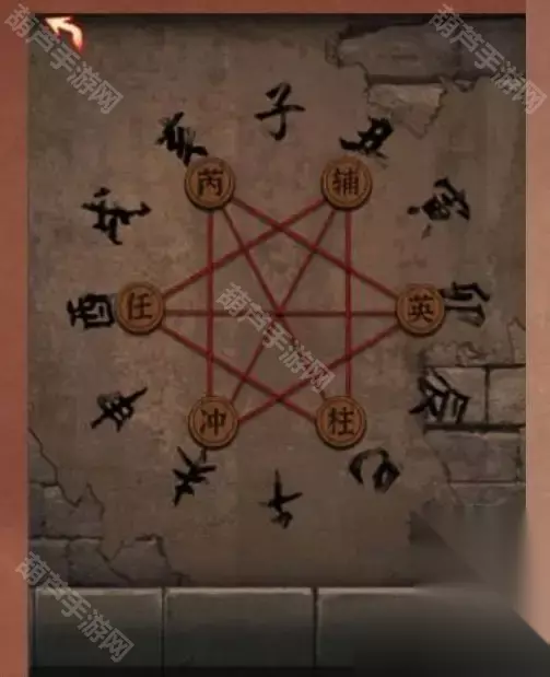 8.点击上方掉下的石剑,将石剑放入到巴将军的浮雕凹槽中。 9.查看灯架上的灯,点击旋转灯罩查看时辰与星位的对应关系,每个时辰对应两个星位。每个时辰的星位通过红线连接,根据对应关系使每个时辰都能正确与星位对应。调整墙上的阵法,答案如图所示: