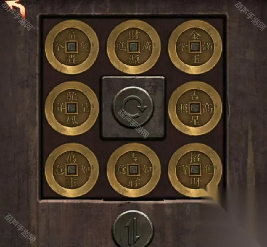 将两枚铜钱都放在柜子上的盒子上,先把任意铜钱放在下面位置,然后转一圈上面的铜钱,可以看到下面的铜钱名字,从左上角开始顺时针是富贵-财源-金玉-吉星-招财-吉祥-万事-龙凤,然后利用下面的空格调整一下铜钱位置,完成后拿到一枚硬币。