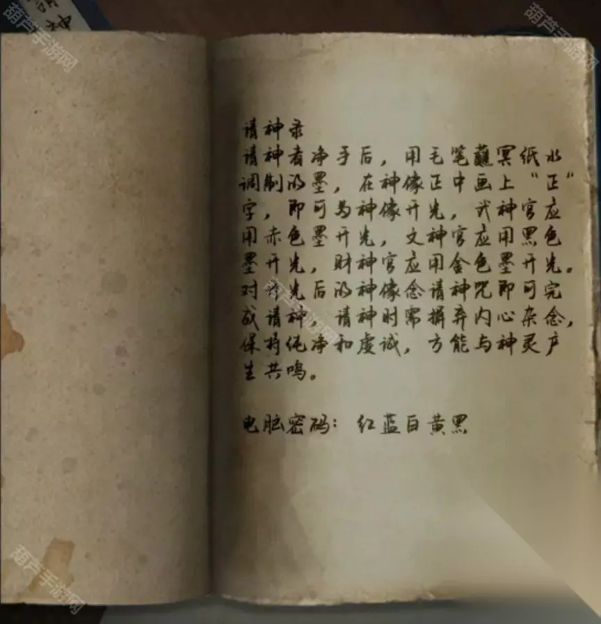 对没有阀门的水龙头使用阀门,点一下打开水龙头,使用纸灰后就获得了纸灰水,后退到第一个场景,查看右下角的下水道,使用磁铁后拿到钥匙,使用钥匙打开复印店的大门,进门后查看一下左边桌子上的请神录,我们需要准备红色纸灰墨,还有个提示电脑密码红蓝白黄黑。