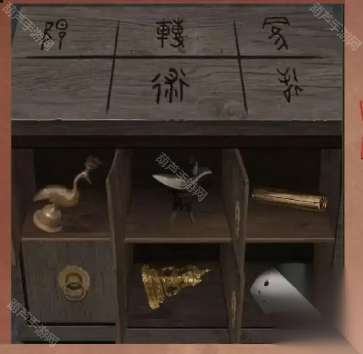 12.从镇墓兽口中拿到夜明珠,将夜明珠装在水池中的凹槽中。根据水面的倒影得到书柜上机关的密码,密码以上下为:亨元贞干利。 13.查看书柜,铜鼎,陶俑,壁灯和香炉上的花纹结合书上分类得到符文与类型的对应关系,根据符文与物品类型对应关系调整物品位置,在祭坛的左边的右边柜子,答案如图所示: