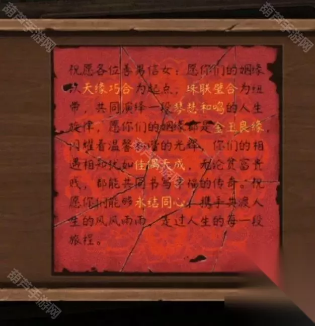 回到院子中查看右边的树,然后就莫名其妙的给树浇酒,完成后树上飘下一个红包,查看红包后使用剪刀就能拿到一张冥币,然后查看一下树上挂着的牌子,这些词看起来都很熟悉啊,前面拼图拼好的顺序天缘巧合-珠联璧合-琴瑟和鸣-金玉良缘-佳偶天成-永结同心依次点击之后拿到钥匙。