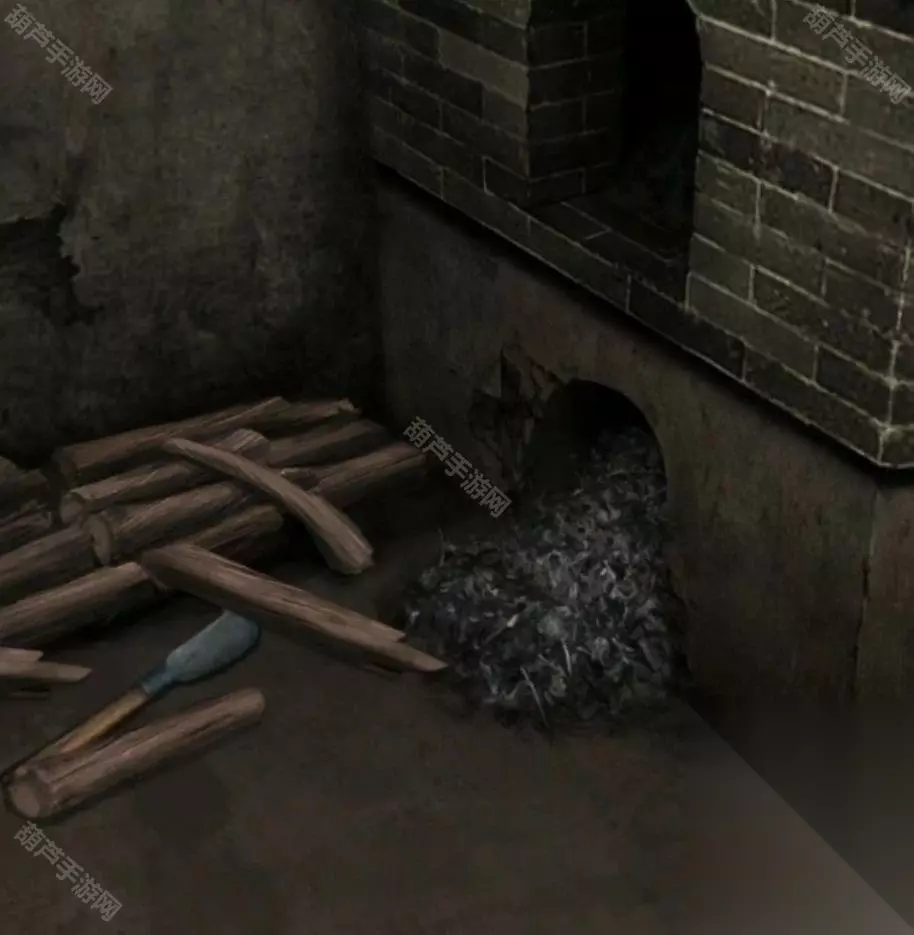 查看两个门中间的木机器,使用摇把后获得一些纸钱,查看右边的门,使用钥匙开门进入厨房,厨房左边脸盆旁边拿到一个水桶,右边炉子上拿到一壶开水,右边炉灶里面拿到烧火棍,炉灶左侧的木柴点一下发现可以挪开,优先挪开上面的就能看到下面的刀了,全部挪开拿到柴刀,恩,突然穿越到寒蝉的感觉。