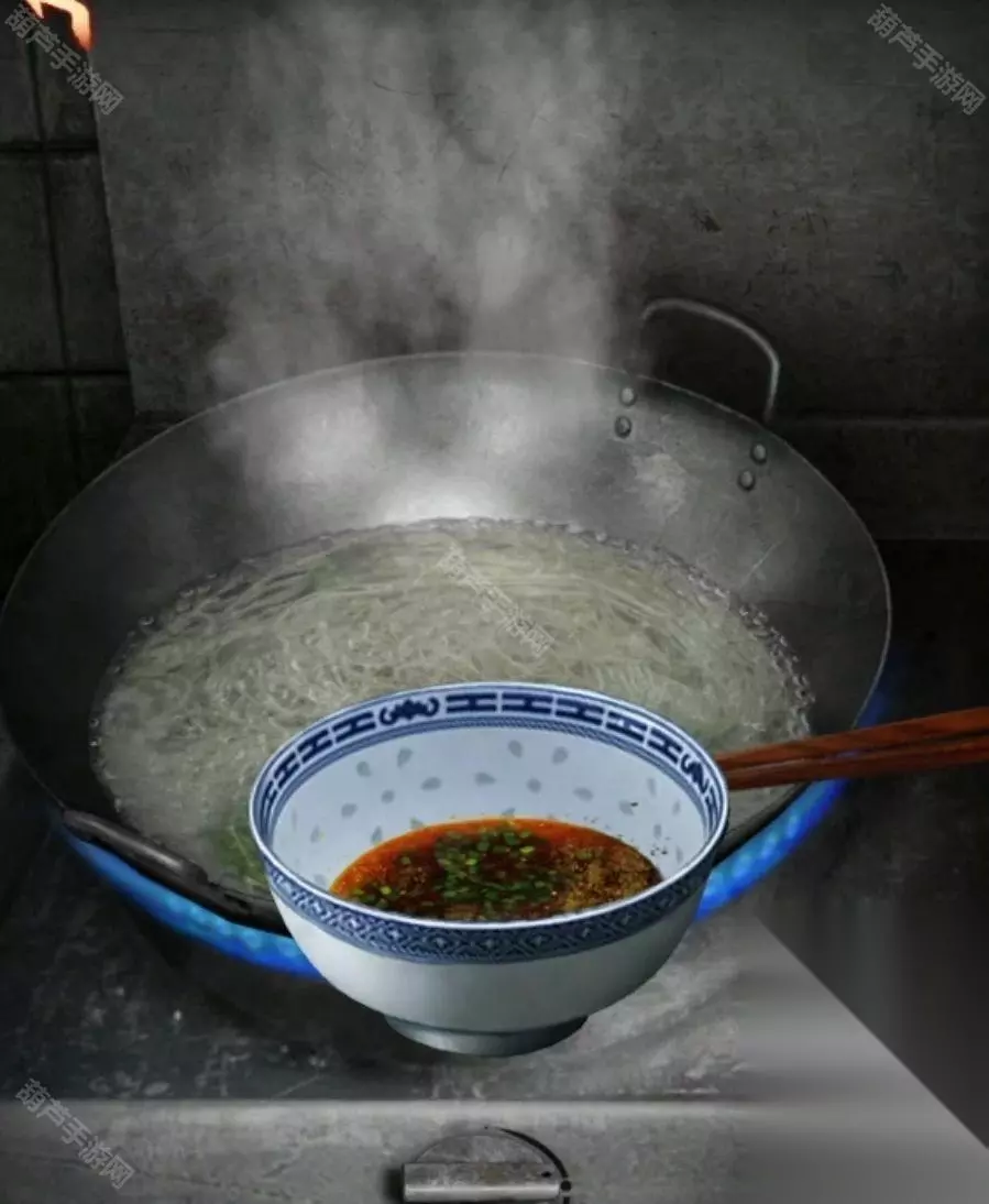 查看右上角的灶台,点击开关打开燃气,将冰块放入锅中,冰块融化后看到一把钥匙,使用筷子拿到钥匙,提示水还没开,所以后退一下对右上角柜子使用钥匙打开看到一个罐子,使用刀子开封后拿到猪油,查看左边的料台,将葱花猪油都放进去后加入高汤就获得了料碗,对右边的锅使用筷子拿到小面完全版。