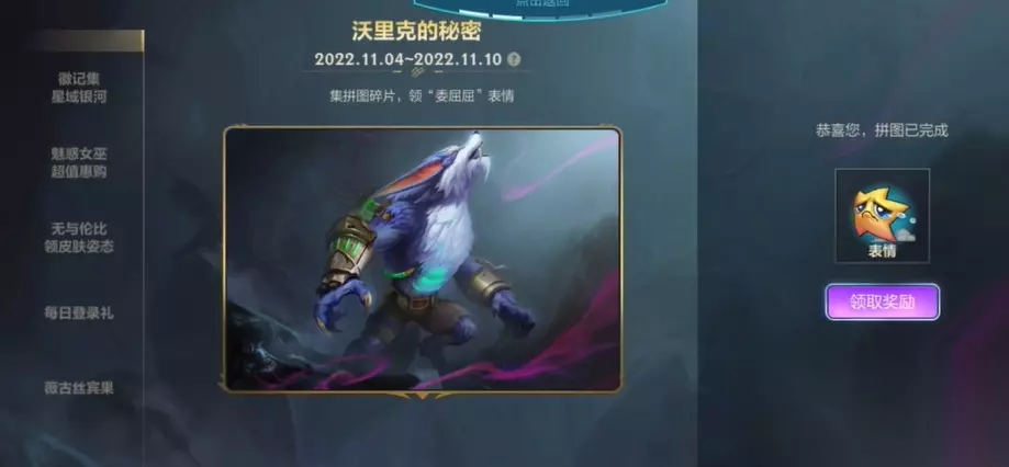 活动规则及奖励: 活动时间:11月4日~11月10日,活动期间可以通过完成任务获得拼图碎片,然后根据策略提示拼凑完整的拼图 每天可以得到四块碎片,完成拼图需要16块碎片,最快4天完成 【活动奖励】龙魂水晶*530,“委屈屈”表情*1
