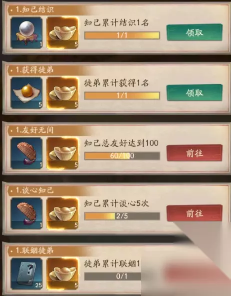 2、获得徒弟 5个活力丹和5个元宝,累计获得1名徒弟后达成,在达成任务后,任务可刷新升级。 想要达成获得徒弟,可以和知己游湖或者泛舟,有一定几率获得徒弟。 3、友好无间 奖励一把木梳和5个元宝,达成条件是知己好友度总共达到100.完成任务后可以刷新任务并升级。 想要提升知己的亲密度,可以通过赠送礼物,例如木梳,耳环等方式。另有游湖或者泛舟,谈心也可以提升亲密度。