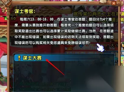 END 注意事项 Tips:"谋士大赛"是一个定时活动,每周六的13点开始,16点结束。每位玩家在这个时间段内只能参加两次。随着你在比赛中解答的题目数量的增加,你可以累积越来越多的经验奖励。这意味着后面的题目所能得到的经验奖励会比前面的题目更多。