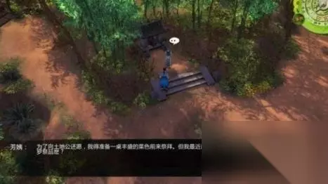侠客风云传杜康村完美详细全攻略 任务01:还愿土地公 奖励:玉佩 step1.在村口的分岔路口处有一个土地公小庙,有位叫作芳姨的夫人希望准备一桌丰盛的菜色前来祭拜,可是她最近闪到腰行动不方便,希望“你”可以替她搜集到需要的祭品,那就是鸡肉、山猪肉和草鱼。