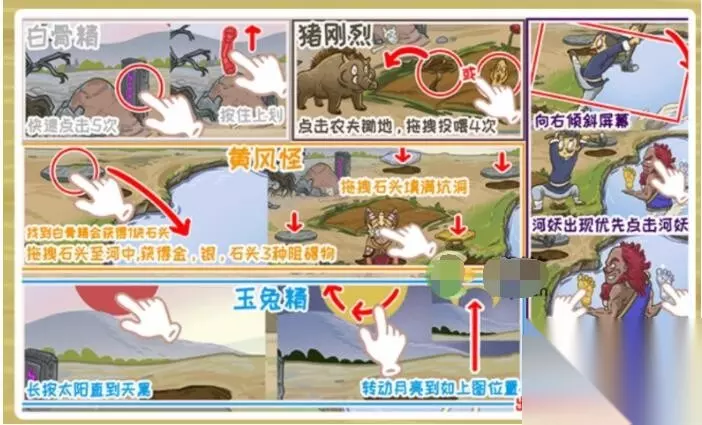 1 、首先快速点击五次墓碑,再按住出现的骨头往上滑,找到白骨精 2 、然后点击农夫锄地,拖拽出现的植物给野猪吃,四次后可以找到猪刚烈 3 、找到白骨精会获得1块石,拖拽石头至河中,获得金 、银 、石头3种阻碍物,拖拽石头填满洞坑,找到黄风怪 4 、长按太阳直到天果,转动月亮如图位置,找到玉兔精 5 、最后向右倾斜屏幕,河妖出现优先点击河妖,之后再点击他手上的金脚和银角即可 2022-12-30 16:18:45 作者:小鹿乱蹦 西游梗传第56关乡野觅仙踪需要找齐7位神仙,一些小伙伴还不知道要怎么做,下面小编就给大家带来了西游梗传第五十六关乡野觅仙踪通关攻略,希望能够帮助到大家。 西游梗传第56回怎么过 1 、将右边鹅的脖子拉长,就会出现嫦娥。 2 、接着路过一位大叔,点击他他会说「天王盖地虎」,再把远处的宝塔放在他手上,他就会变成托塔李天王。 3 、点击左边的红绳往下拉,一直拉到底会掉下来一个老人,他就是月老。 4 、点击右边玉米地里的玉米,拔出来就能找到玉帝。 5 、点击左边树上的苹果,掉下来砸到过路的人,他就会变成太白金星。 6 、将路过的大仙的衣摆拉起来,再脱掉他的靴子,就会找到赤脚大仙。 7 、静静等待30秒,农夫就会睡着,黑白无常就会现身,就能通关了。 以上就是西游梗传第五十六关乡野觅仙踪通关攻略,希望能够有所帮助。更多相关攻略和资讯可以关注游侠手游,之后将为大家带来更多精彩内容。 每天9分钟不靠低收入!5元起投轻松上手,注册送307元体验金 巨鲸订购 版本 1.9.58 立即下载 广告 隐私 权限 中京商品交易市场有限公司 相关推荐 《西游梗传》攻略45关 第45关蒸笼受困通关攻略 2022-12-13 10:46:13 《西游梗传》第7关更多结局攻略 七仙女四种结局是什么 2022-12-13 13:51:51 《西游梗传》第13关怎么过 第十三关计降八戒通关攻略 2022-12-13 17:13:42 热门游戏 新射雕群侠传之铁血丹心 角色扮演 战魂铭人 角色扮演 收纳物语 赛车空战 百变大侦探 赛车空战 艾彼Abi 角色扮演 双生怨 冒险解谜 梦幻花园 益智休闲 部落冲突:皇室战争 益智休闲 全部评论 还没有评论内容,快来抢沙发吧! 我来说两句… 《西游梗传》让白骨精现出原形过法如下: 工具/原料 iPhone13 IOS15 西游梗传6.5.4 1 、进入游戏之后,点击唐僧,他会叫悟空,猴子转过头,点击猴子的脸,注意是猴子的头扭过来之后点击猴子。 2 、然后猴子的脸会放大,按住猴子的两颊4秒钟。 3 、然后向内滑动4下。 4 、猴子张开嘴之后,往外滑动4下。 5 、眼保健操昨晚之后猴子的火眼金睛就好了,让白骨精成功显形通关就成功了。 《西游梗传》第十二关白马化龙通关步骤如下: 操作环境:小米11 、MIUI13 、西游梗传游戏最新版等。 1 、点开游戏,进入第十二关。 2 、这时,我们需要了解任务的要求是将白马变化成白龙马。 3 、根据任务的要求,点击白马的前面两只马蹄按照逆时针的方向旋转。 4 、接着需要将马蹄放在前方的位置,白马即可变身成为白龙马。 《西游梗传》简介: 最新版是一款非常魔性无厘头的解谜益智类游戏,风趣搞怪的美术动画,逻辑大师级的解谜难题,紧跟潮流的玩梗文化,群英荟萃,火爆全网,折磨无数少男少女的脑细胞。这么一款将现代梗与经典名着相融合,用脑折磨玩家,用心服务脑细胞的正经解谜游戏,请高速运转你的小脑袋瓜,保持足够的理智与清醒去帮助取经5人组度过九九八十一难。 游戏为大家带来了风趣幽默的西游取经剧情,其中也有着超高的游戏画面效果,而且将会改变你对于西游背景的认知。让你可以享受到更多的游戏内容,享受到非常有趣的西游冒险!此外,西游梗传游戏为玩家准备了大量的道具可以使用,不同的场景设置,你可以在不同的场景中获得不同的道具,也可以通过使用道具来提高自己逃脱的概率。 收服沙和尚通关攻略: 1 、首先我们打开游戏,等待片刻,头上出现感叹号,就点击唐僧; 2 、然后会钓到很多小动物,我们在这里进行合成,直到召唤神龙; 3 、最后许愿,点击里面的牌子,观音菩萨出来即可。 注意事项: 1 、前往不能钓到暴躁的龙王,很可能直接结束; 2 、钓到偷鱼的黄袍怪,它会偷走我们的鱼。 西游梗传是一款益智小游戏。改编不是乱编,戏说不是胡说,高速运转你的小脑袋瓜,帮助师徒四人顺利通过九九八十难,与孙悟空一起拳打四大天王,脚踢东海龙王,重走西天取经路! 操作指南:鼠标左键操作。 如何开始:游戏加载完毕后点击【开始游戏】即可。 游戏目标:合理操作,挑战关卡,解开谜题! 游梗传最新版是一款非常魔性无厘头的解谜益智类游戏,风趣搞怪的美术动画,逻辑带师级的解谜难题,紧跟潮流的玩梗文化,群英荟萃,火爆全网,折磨无数少男少女的脑细胞。这么一款将现代梗与经典名着相融合,用脑折磨玩家,用心服务脑细胞的正经解谜游戏,请高速运转你的小脑袋瓜,保持足够的理智与清醒去帮助取经5人组渡过九九八十一难。 游戏为大家带来了风趣幽默的西游取经剧情,其中也有着超高的游戏画面效果,而且将会改变你对于西游背景的认知,让你可以享受到更多的游戏内容,享受到非常有趣的西游冒险!此外,西游梗传游戏为玩家准备了大量的道具可以使用,不同的场景设置,你可以在不同的场景中获得不同的道具,也可以通过使用道具来提高自己逃脱的概率。 以上就是关于悟空有点皮第五十六关这怎么过全部的内容,如果了解更多相关内