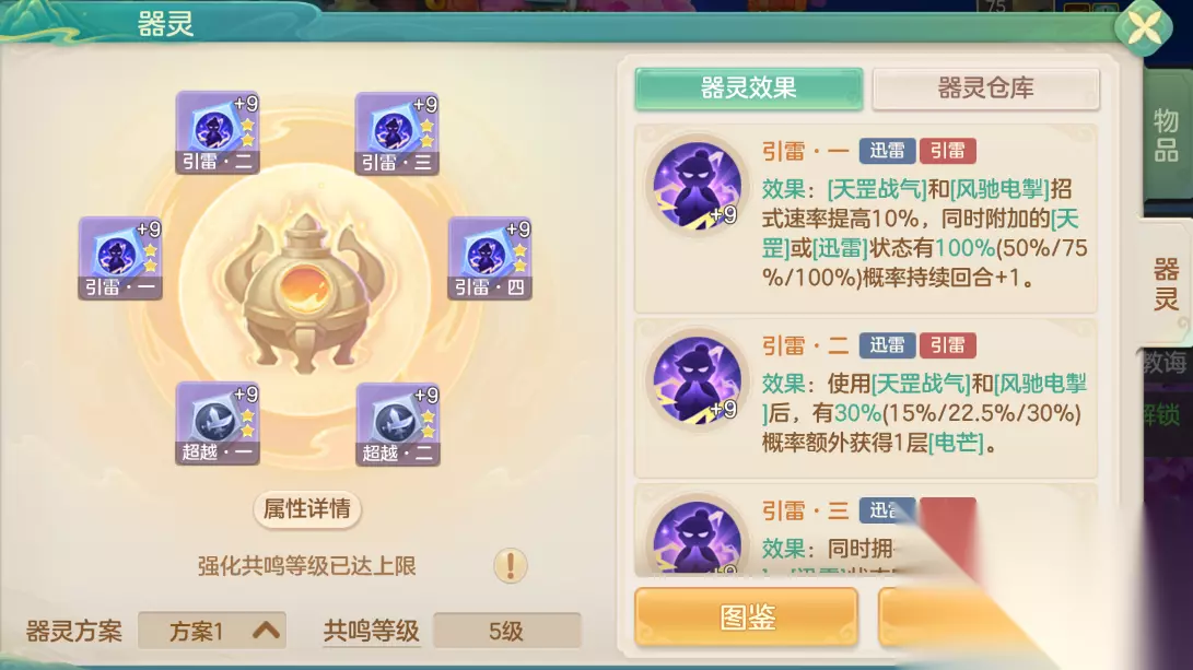 【梦想世界长风问剑录天雷群伤流天赋】 推荐器灵 【引雷】器灵套装:整套器灵对风驰电掣,天罡战气以及雷电法王状态进行了强化。一方面,风驰电掣和天罡战气提供的增益获得增强并且额外提供电芒,使自身更快进入雷电法王状态,另一方面使雷电法王额外获得增益以及特殊效果,使天雷符更具威力。