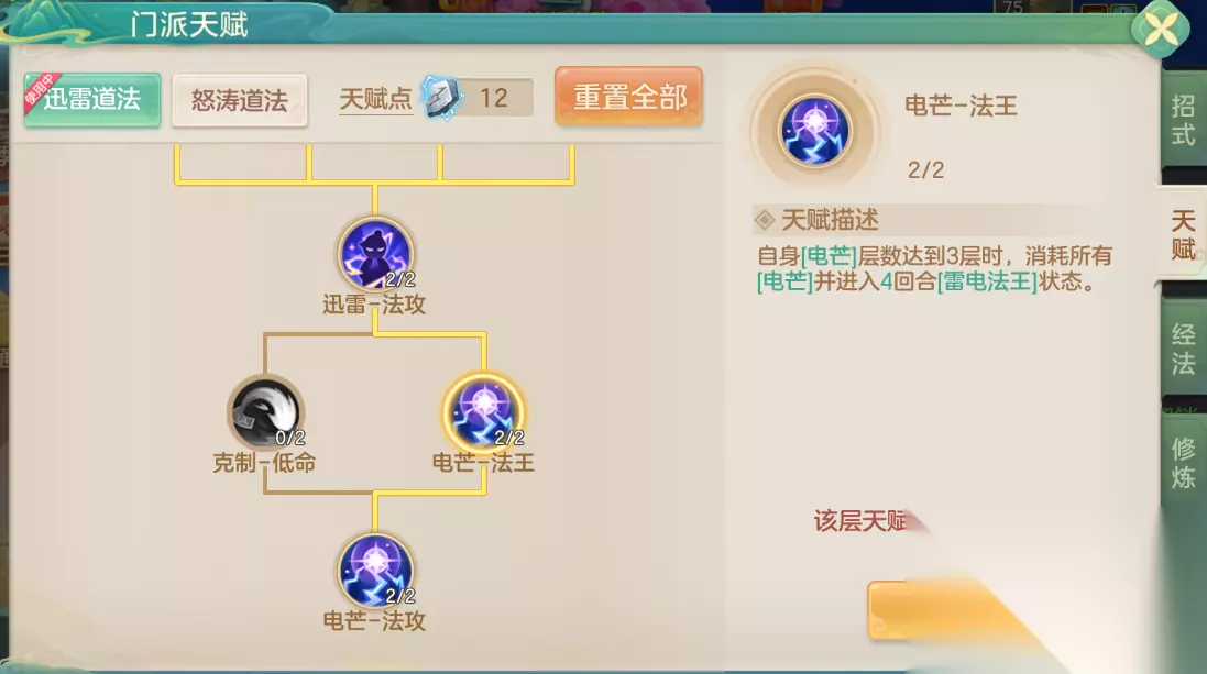 【梦想世界长风问剑录天雷群伤流招式】 推荐天赋 电芒-法王:当电芒积攒到一定层数后,会进入强大的雷电法王状态,该状态会增幅群攻招式。
