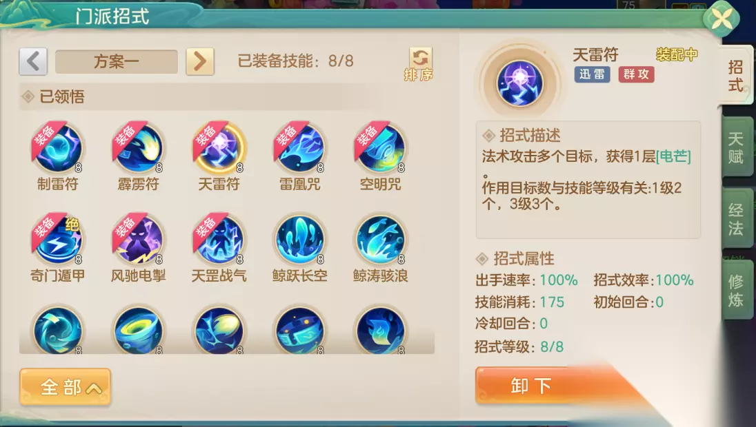 《梦想世界:长风问剑录》迅雷道法天雷群伤流攻略 一、流派介绍 迅雷道法是以高速施法为特色的战斗流派,其战术体系围绕核心机制"电芒"构建,通过蓄能积累与能量释放的交替循环形成持续战斗力。该流派擅长利用高机动性实现多样化战术目标,既能通过增益强化提升团队作战能力,也可运用控制与解封技能扭转战局,展现出极高的战术适应性。在属性培养策略上,建议优先提升魔力属性确保基础输出强度,配合适量敏捷属性优化行动节奏,通过精准调控施法间隙来创造更有利的技能衔接条件。 二、推荐构筑 天雷群伤流 推荐招式 天雷符:对敌方多个单位造成伤害并获得1层电芒。 风驰电掣:提供迅雷效果,能够提高己方速度并使其对低速单位造成额外伤害,释放时自身获得1层电芒。 天罡战气:提供天罡效果,能偶提高己方物理攻击以及法术攻击,释放时自身获得1层电芒。