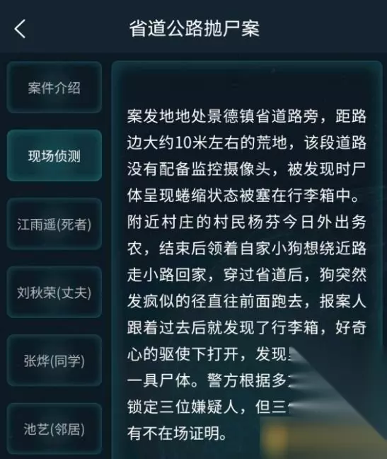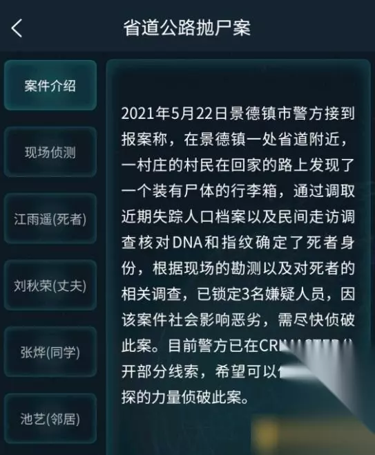 《Crimaster犯罪大师》省道公路抛尸案答案解析 一、案件介绍 2021年5月22日景德镇市警方接到报案称,在景德镇一处省道附近,一村庄的村民在回家的路上发现了一个装有尸体的行李箱,通过调取近期失踪人口档案以及民间走访调查核对DNA和指纹确定了死者身份,根据现场的勘测以及对死者的相关调查。 已锁定3名嫌疑人员,因该案件社会影响恶劣,需尽快侦破此案。 目前警方已在CRIMASTER公开部分线索,希望可以借助全球侦探的力量侦破此案。
