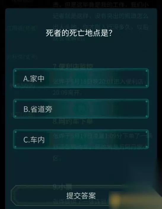 三、答题内容 题目一:死者死亡地点是? A:家中 B:省道旁 C:车内 参考答案:C:车内 题目二:谁制造了不在场证明杀害了死者? A:刘秋荣 B:张烨 C:池艺 参考答案:A:刘秋荣