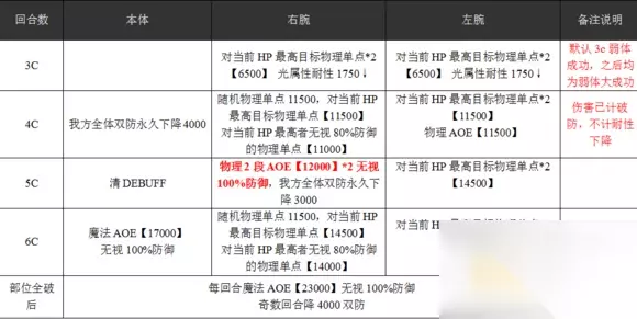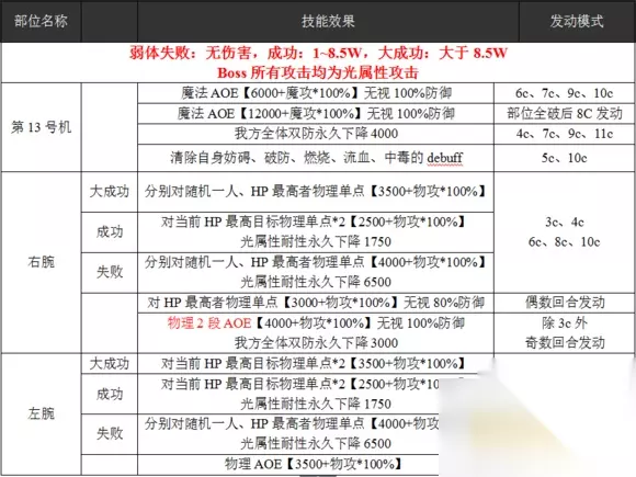 五、注意事项 秋盗贼互相配合,一人主控,一人提供buff并辅助控制。没有硬性要求; 控制8w5的最小面板:31250; (4链无暴击或特效刀) 主体魔法阻挡上限为4000,两部分物理阻挡上限为4000。但由于主体会在5c时清除debuff,所以魔法阻挡只会在6c时生效,所以不推荐魔法封锁; A0E数量一定要充足,否则很难爆炸;秋和贼可以考虑带一把强力的单剑来进行最后一击。 (全身血量比部位多100万) 虽然很多BOSS伤害无视100%物理防御,但是物理护盾对于破防还是有效果的。 4c的防御破4000,5c的防御破3000,还要维持7000的护盾量,不容易,所以千万不要放弃叠护盾 超级弩神化第13单元攻略指南 六、各职业配卡