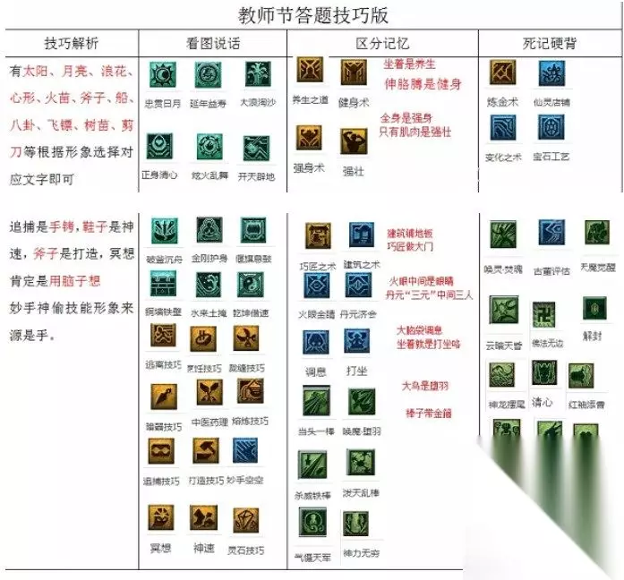健身术要尽可能的高!毕竟,看图说话需要消耗体力。而健身术,正是提高体力上限的技能! 家里的清洁指数、耐久度,要提前提升至满状态。 这样,才可以恢复更多的体力。除此之外,卧室的规模,也影响着休息次数。 每天的百岁香、海马,一定要吃!今年的教师节活动时间是9月7日12:00-9月13日12:00!但是,9月13日的11:00是最后1次答题!所以,海马一定要在8:00之前吃!而百岁香,只要在11:10之前吃完,并将获得的体力消耗掉,就OK。 任何消耗体力的玩法,都不要参加。除此之外,尽量也不要挖低级藏宝图。因为挖低级藏宝图时,如果遭遇了尸瘴的话,会扣除一定的体力!还有,世界喊话也是要消耗体力的哦!知识老人出现的地点和坐标为:西梁女国:(134,35)、(83,62)、(28,99)、(18,51)傲来国:(154,94)、(141,69)、(139,20)、(54,125)朱紫国:(126,63)、(27,70)、(49,32)、(130,17)建议:去傲来国、朱紫国找!因为这两个场景,可以定导标旗!这样,可以更快的找到知识老人。还有一点值得注意的是,知识老人每次只存在10分钟!所以,建议在9分50秒左右的时候,就停止答题。 每种技能的颜色,是不一样的。其中,剧情技能为蓝色、帮派技能为黄色、门派的主技能为暗红色、下属技能为暗绿色。而坐骑技能,则为亮绿色。掌握了这些,绝对可以让你事半功倍!还有一点,中国的文字,有很多是由图画文字演化而来。在梦幻西游中,有很多的技能,也是如此。一个小人在跑,肯定是逃离技巧了。 大家可以看看这篇文章,233乐园小编给大家带来的梦幻西游2022教师节活动看图说话攻略最全,请关注233乐园手游网以获取第一时间的资讯更新信息。 免责声明:以上内容源自网络,版权归原作者所有,如有侵犯您的原创版权请告知,我们将尽快删除相关内容。