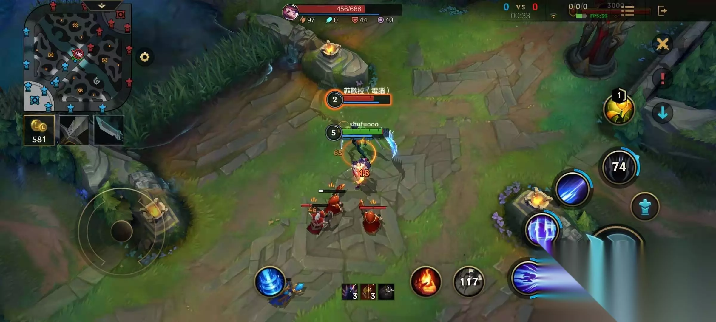 刀妹的输出非常高,但是刀妹的输出来源是她的被动,所以玩家玩刀妹一定不要无脑上。前期可以通过1技能斩杀小兵来叠被动,被动叠满了就伺机击杀对手。要是对手压得很凶,不让你叠被动也不要着急,因为刀妹的3技能晕住对手也是可以产生标记的,这样1技能对手是不会进入CD的。当然对手离残血兵进的时候,可以先手三技能对手,再用1技能残血兵去平A消耗对手。 四、团战技巧