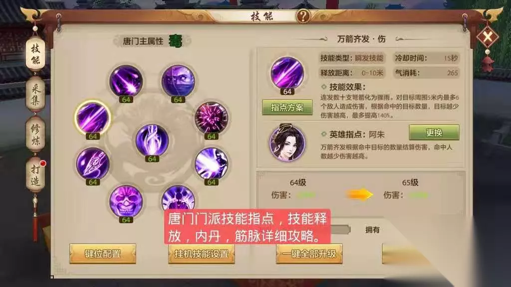 新天龙八部:唐门技能解析 新天龙八部作为一款热门角色扮演游戏,一直以来都备受玩家们的热爱。而在游戏中,唐门可谓是一支非常强大的门派,拥有一系列独特的技能。今天我们就来一起解析下唐门的技能。 毒龙钻 毒龙钻是唐门的必杀技,对敌人造成十分致命的伤害。不过需要注意的是,毒龙钻对距离有一定的要求,只有距离非常近的敌人才会造成爆炸性的伤害。 催眠之术 唐门的催眠之术可以让敌人进入催眠状态,昏迷一段时间。在团队作战中,如果能够成功催眠敌人,就能大大降低战斗难度,提高团队胜率。 迷魂术 迷魂术是唐门非常经典的一个技能,可以让敌人进入幻觉状态,视觉上产生错觉。这个技能在PVP对战中非常有用,能够让对手陷入幻觉之中,提供自己的攻击机会。 金钩银刺 金钩银刺是唐门的输出技能之一,可以造成相当高的伤害。需要注意的是,在使用金钩银刺的时候,需要一定的体力储备才能够发挥出最大的威力。 玉蜂群袭 玉蜂群袭是唐门比较特别的一个技能,可以向周围区域释放出一群玉蜂,对范围内的敌人造成伤害。和毒龙钻一样,玉蜂群袭需要距离相对较近的情况下才能够发挥出最大的威力。 飞蝗之毒 飞蝗之毒是唐门极为致命的一招,可以让敌人进入中毒状态,并在短时间内造成大量伤害。需要注意的是,飞蝗之毒需要一定的距离才能释放,所以需要在合适的距离下使用。 结语 总的来说,唐门的技能虽然看上去非常强大,但在实际游戏中,需要非常娴熟的操作技巧才能够发挥出最大的威力。因此,如果你打算选择唐门作为自己的门派,一定要多加练习,磨练自己的操作技巧。