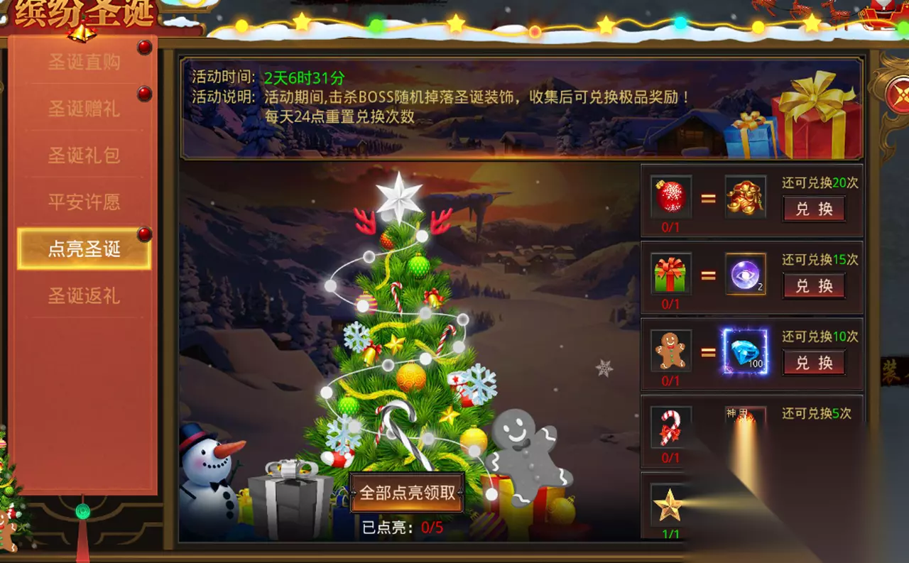 【点亮圣诞】 活动期间击杀BOSS掉落道具点亮圣诞树获得奖励,点亮所有领取额外奖励!