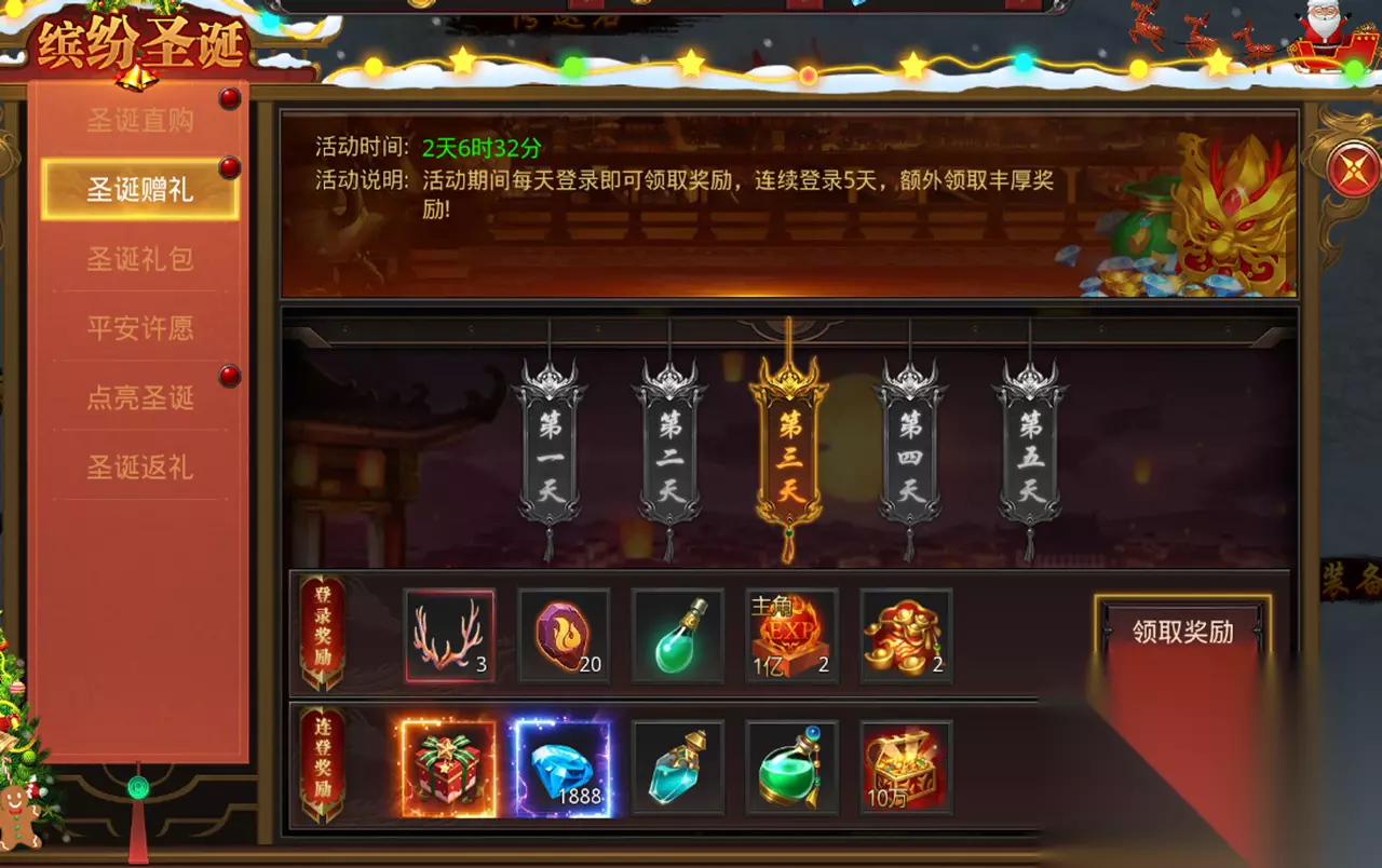 【圣诞赠礼】 圣诞盛典,任性赠礼,活动期间,每日登陆游戏即可免费领取活动奖励,连续登录5天还可额外领取狂欢礼盒。