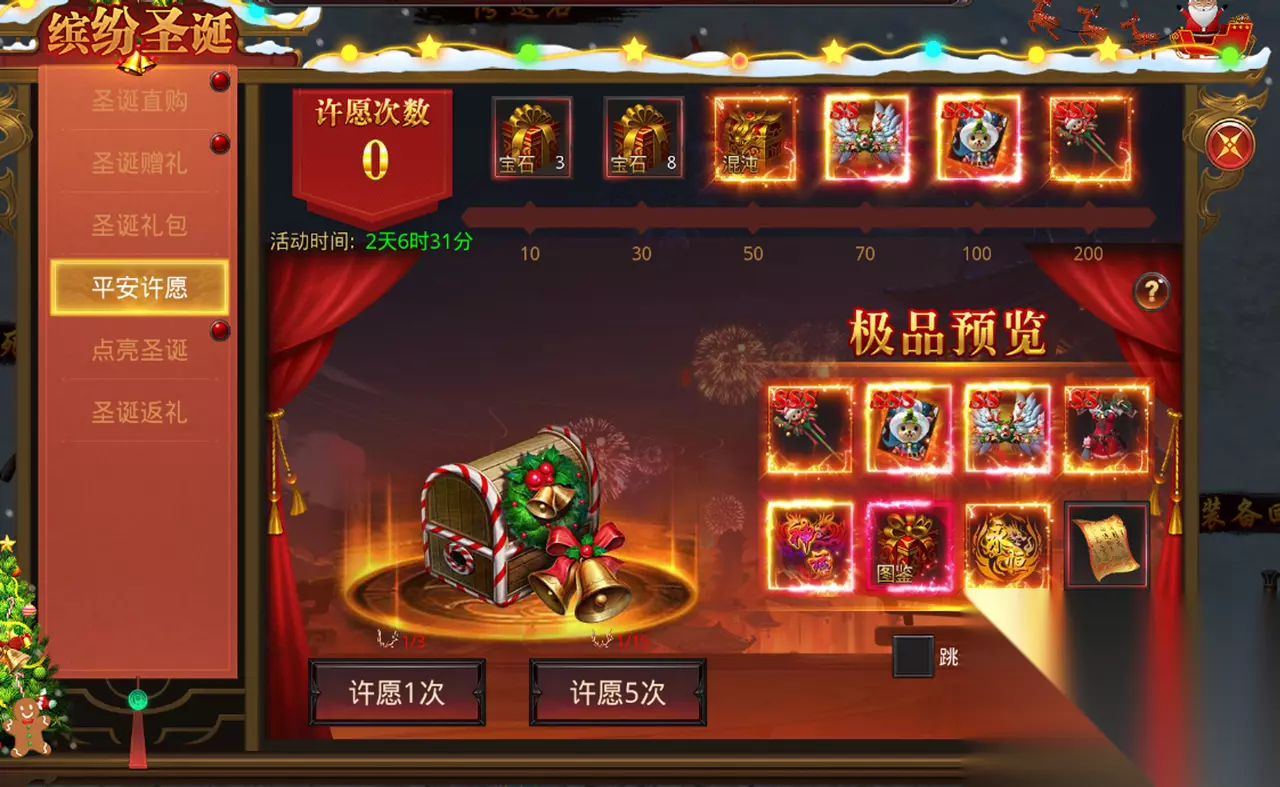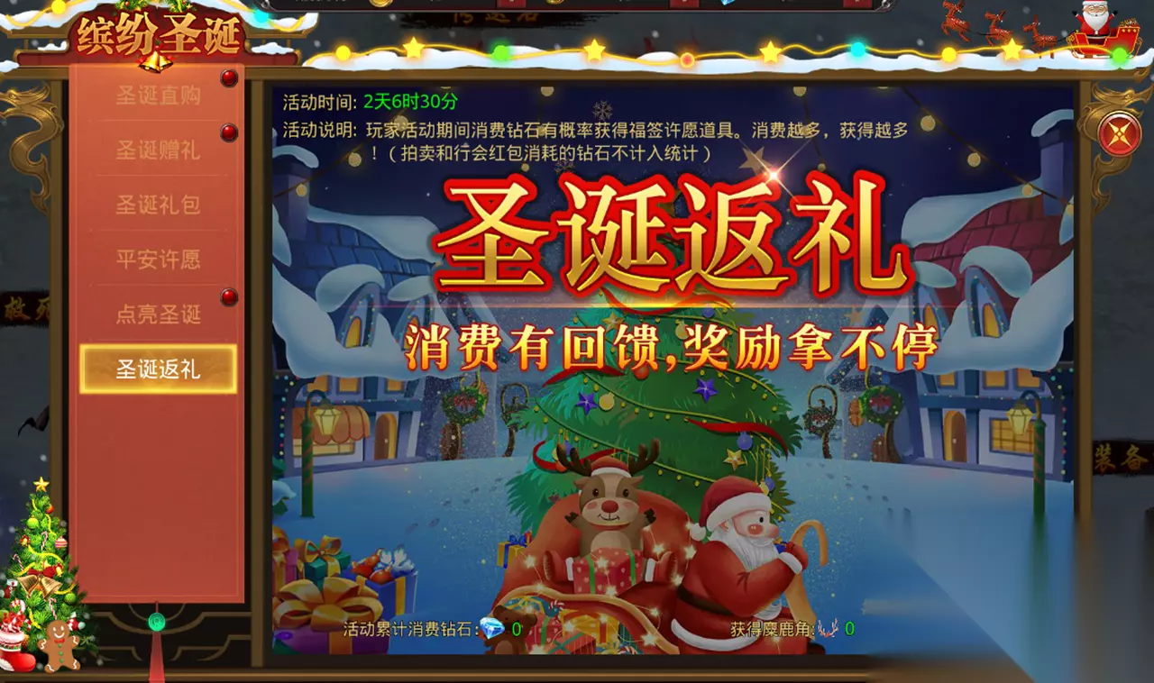 【圣诞返礼】 活动期间每消耗一定钻石,有概率获得福签许愿道具。消费越多,获得越多!(拍卖和行会红包消耗的钻石不计入统计)