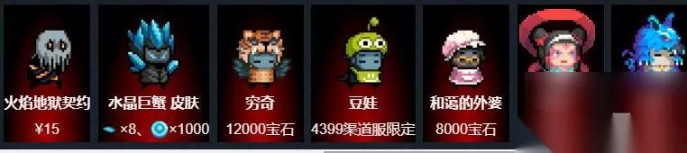 火焰地狱契约:15 水晶巨蟹皮肤:x8、x1000 穷奇:12000宝石 豆宝宝:仅限4399频道服务器 慈祥的奶奶:8000宝石 哪吒:15元 天狼星:10元