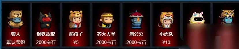 狼人:默认获得 铁狼:2000颗宝石 儿童可以:5元 美猴王:2000宝石 海太监:2000宝石 小老虎:10元 复活节彩蛋:2000颗宝石 捷豹:10元