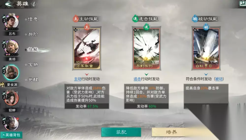 技能搭配是决定该流派上限的核心要素。夏侯渊主动技推荐【万军取首】,基础倍率扎实,当敌方兵力低于50%时,伤害额外提升50%,大幅提升残局收割效率;追击技【齐射阵列】可降低目标单体10%防御,并附加高额伤害;被动【白虹贯日】提供20%暴击率,配合暴击伤害翻倍机制,显著放大瞬时输出。貂蝉主动技可随机削弱敌方三名单位10%攻击,若目标魅力值低于自身,则有40%概率施加混乱状态,干扰敌方行动节奏。