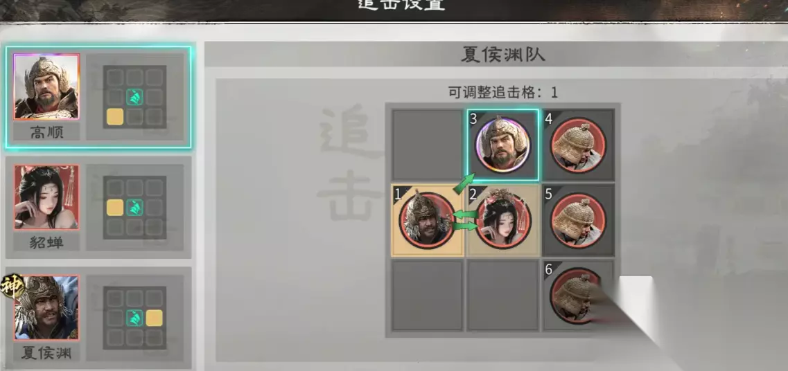 阵容采用“双辅一核”结构:夏侯渊担任主输出位,高顺与貂蝉分别承担增伤承伤与机制触发双重职能。三名武将形成闭环协作——高顺提供前中期生存保障与伤害加成,貂蝉强化男性单位输出并叠加混乱干扰,夏侯渊则在多重增益下完成爆发收割。兵种配置推荐全藤甲兵,集中部署于前排以最大化减伤效果。站位设计尤为关键:建议将夏侯渊置于高顺与貂蝉的共同追击路径交汇点;貂蝉需站在夏侯渊可触发追击的格子内,而高顺无需占据追击位,确保其技能释放稳定性。