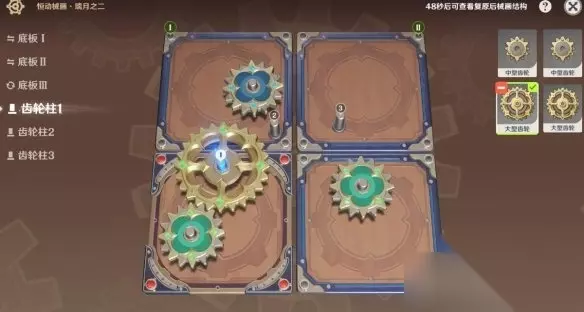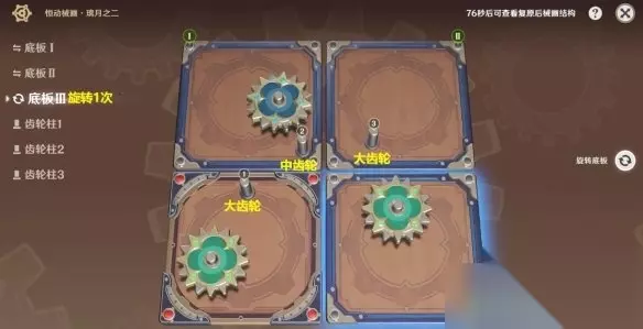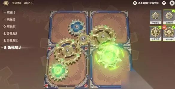 恒动械画璃月之二齿轮复原攻略 活动时间:2023/05/25 10:00 ~ 2023/06/19 03:59 参与条件: 1.冒险等阶≥32级 2.完成魔神任务「离岛逃离计划」 3.完成世界任务「骰子、猫与卡牌的战场」 璃月之一 第一步:底板Ⅰ旋转3次 第二步:底板Ⅱ旋转3次 第三步:齿轮柱1装小齿轮 第四步:齿轮柱2装中齿轮 第五步:齿轮柱3装大齿轮 第六步:齿轮柱4装中齿轮