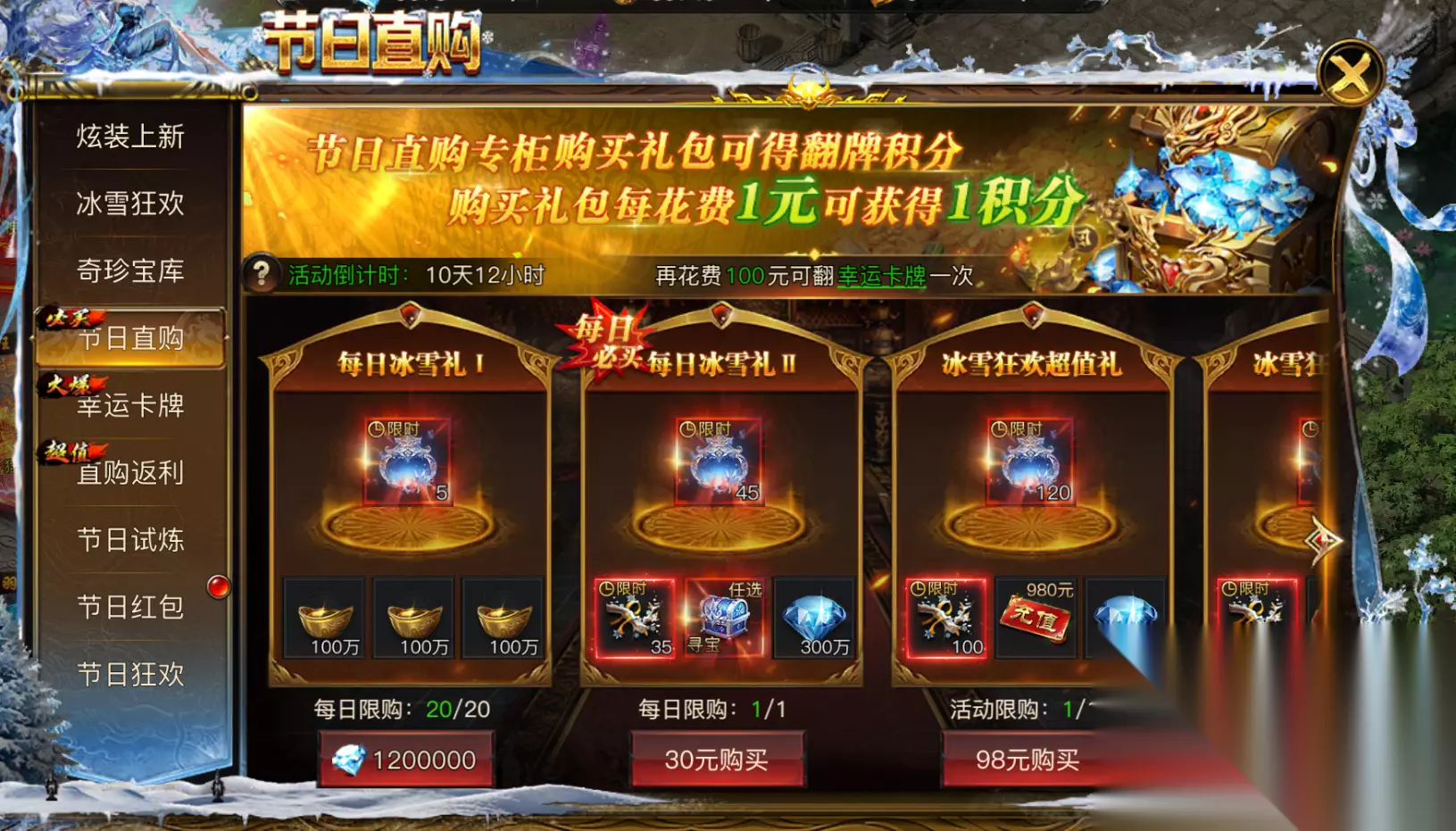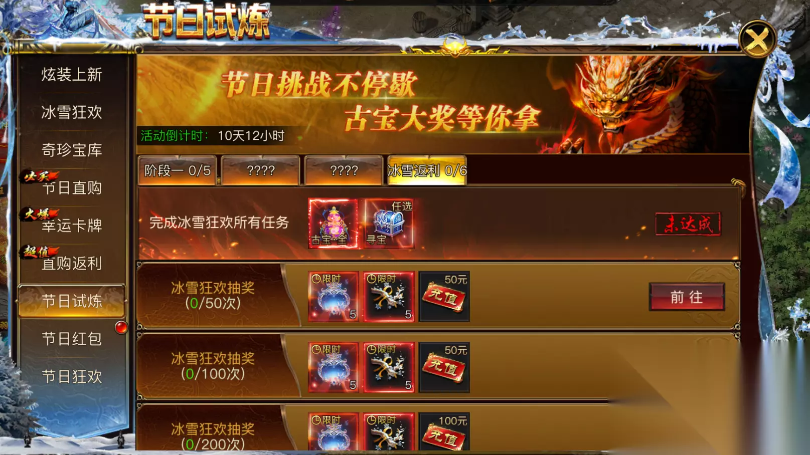 四、直购返利 - 抽奖次数换大礼 统计玩家累计购买抽奖礼包的次数(不算钻石购买,任意挡位都算),达成相应次数就能领取丰厚奖励。每一次购买都是向大奖迈进的一步!