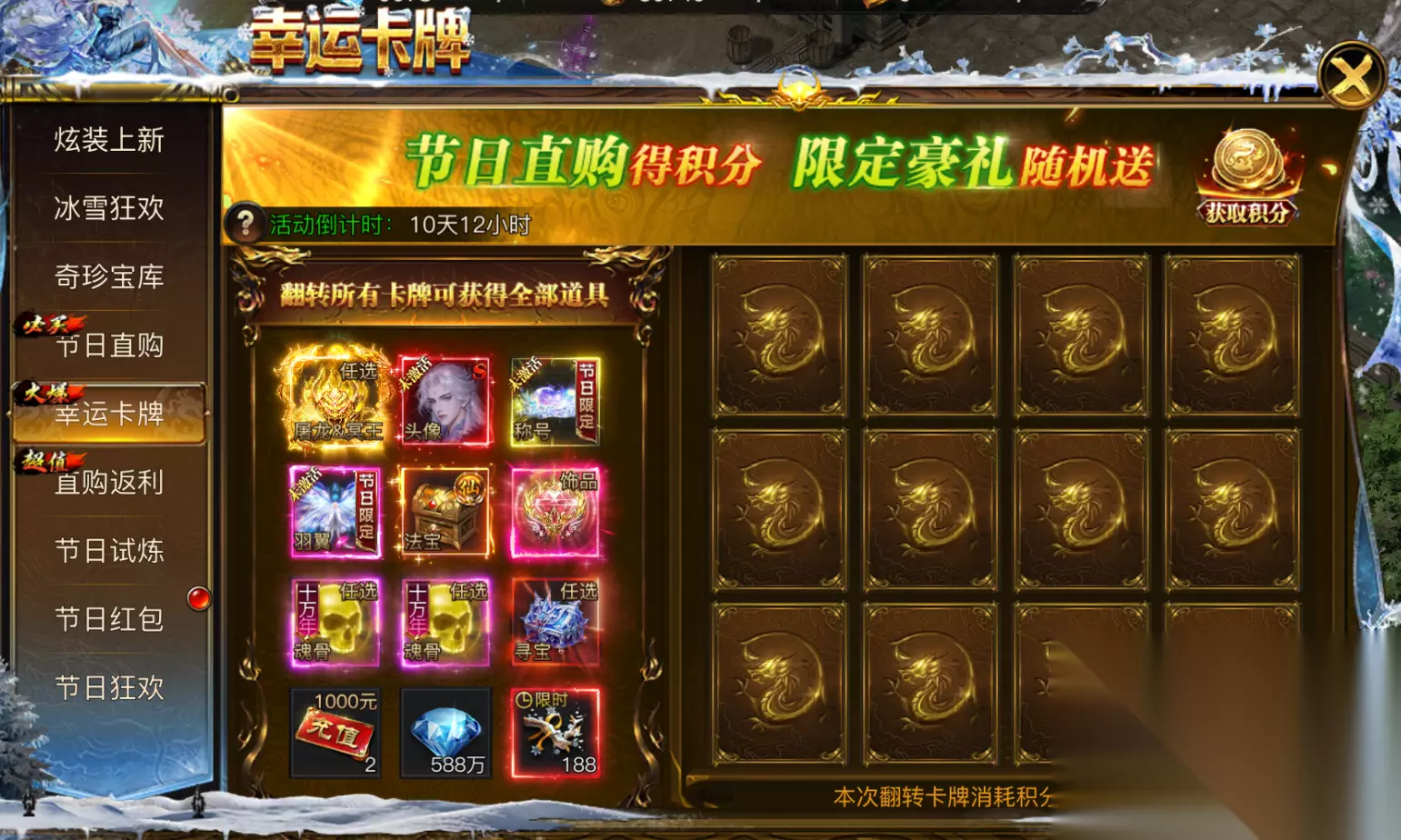 三、幸运卡牌-我是翻牌之王 庆典期间每直购1元可获得1翻牌积分,完成翻牌可获得珍稀道具奖励,限定豪礼随机送,翻转所有卡牌可获得全部道具奖励!