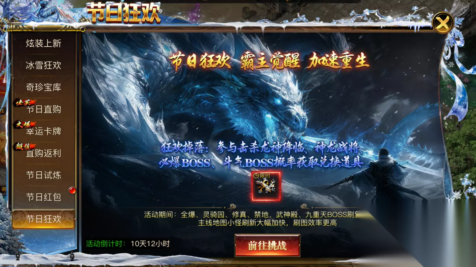 七、庆典狂欢 - BOSS 减负刷不停 可对指定类型的 BOSS 以及主线地图内的小怪减少刷新 CD,让你能更高效地挑战强敌,获取珍贵装备和资源,尽情享受战斗的乐趣!