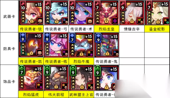 2.在无法领取到元穿祈的情况下: 因为初期等级低,COST少,所以我们采用3元素+2不死族的小费羁绊魂卡组合,参考如下: 优先选择主属性:武器卡(暴击值),防具卡(百分比攻强),饰品卡(冷却缩减)