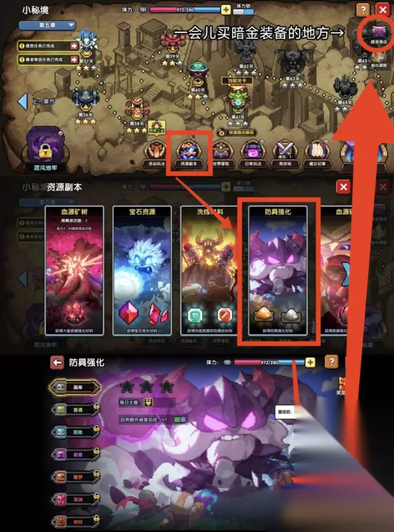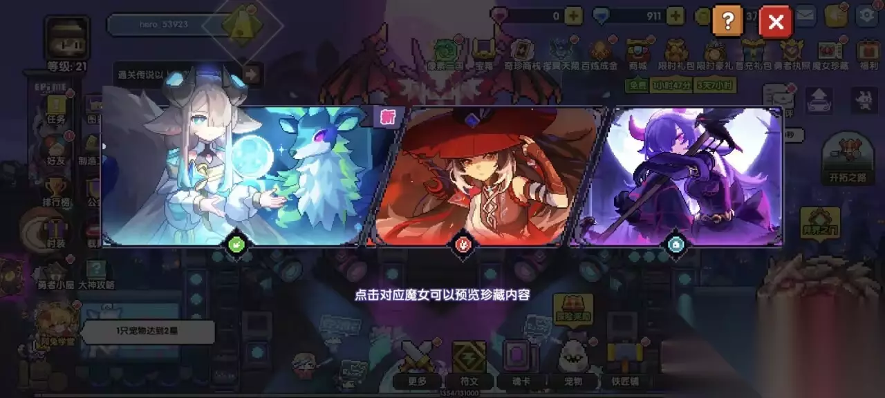 然后就是闷头往35层小秘境推 在此期间,我们解锁了魔女纪事,大家可以去看一看玩一玩,通关一次就能获得10黄金币。 魔女纪事攻略: 在勇者等阶D++后,我们解锁了武器二号位。 记得装备,武器属性最好都是护穿、暴击、首领/对应属攻三条属性 【30层】冲层大礼包给予:魔女宠物自选(新手期护穿来源可能比较缺少,可以选一个瑟西亚在打BOSS的时候帮忙削甲) 【35层】冲层大礼包给予:江东二乔史诗技能自选(新魔女技能数值会比较高,可以直接学习使用) 35层小秘境之后 值得注意的是,如果看见体力条接近1000体力了,那么就把体力锁打开消耗一下,避免溢出亏损。 【40层】冲层大礼包给予:四星定制饰品卡——元穿主属性的祈(高费卡,但是提供大量的属性和效果) 并且这个阶段,游戏解锁魂卡系统,我们的实力打前两个难度应该是没有问题的。 魂卡使用参考 魂卡佩戴需要占用cost,cost上限来源有:角色等级,宠物羁绊(营地守护者),部分魂卡效果。公会可借用宠物羁绊 (有个好工会帮助很大)。 1.在领取到元穿祈的情况下: 从左到右,费用逐渐上升,但是都是新手期常见的组羁绊的搭配: 第一套是元穿祈+2不死族,低费用且提供10%技伤,是新手期很宝贵的属性; 第二套是元穿祈+3元素,提供20%属性伤害,在获得符文加成之前,差不多可以视为20%的纯收益 第三套是元穿祈+3人族(凑齐4人族),获得300护甲穿透,这个一般是70-100层时,护甲穿透压力比较大的时候使用的,因为护甲穿透缺失时,会损失绝大部分伤害。