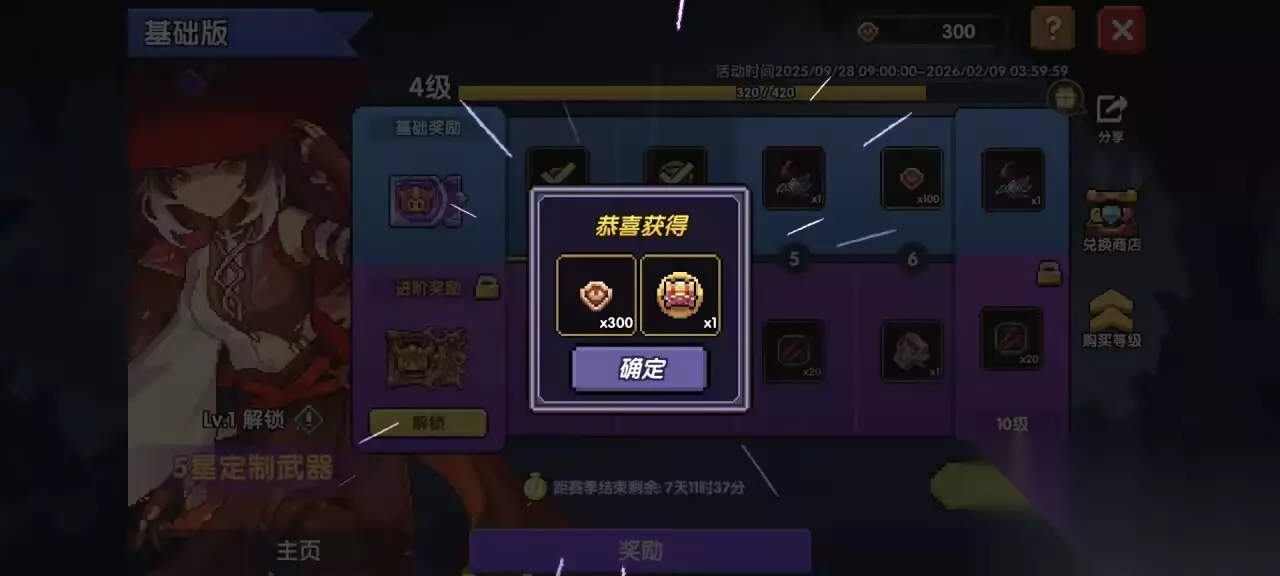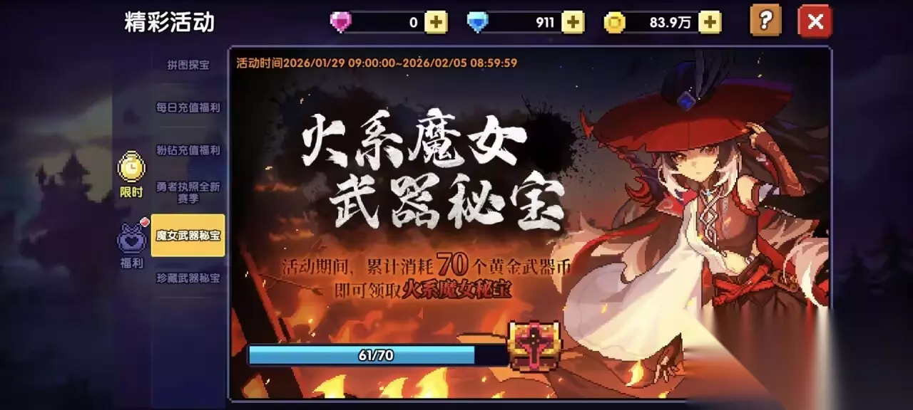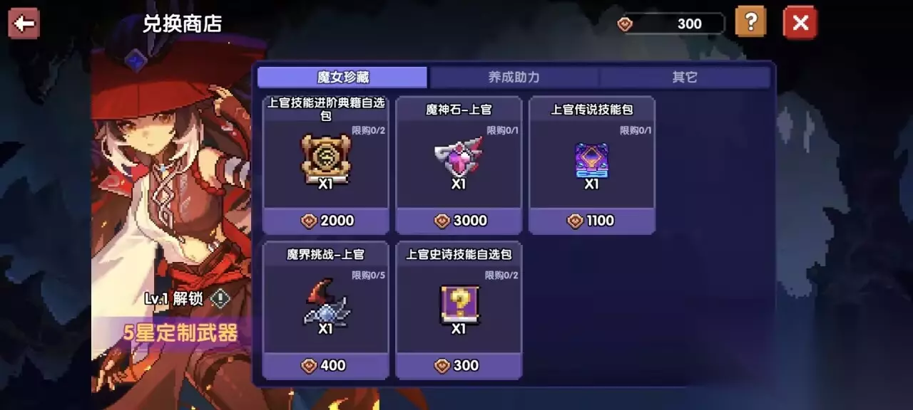 比如,我这个图里面,赠送的火系,那么我就选火系的魔女,并且这个箱子也选择她对应的武器。 截至2026.2.9 水系最新魔女——江东二乔 木系最新魔女——单卡拉比 火系最新魔女——上官 然后获得之后,武器升4星,然后我们去准备技能。 稍微完成一下魔女臻藏的任务,我们就能升到3级,获得300货币,然后去魔女臻藏的兑换商店兑换史诗技能。传说技能也能白嫖,升到22级,即再获得1100货币。 已经领取开荒大礼包,即有江东二乔史诗和传说技能的玩家可以不用兑换技能。
