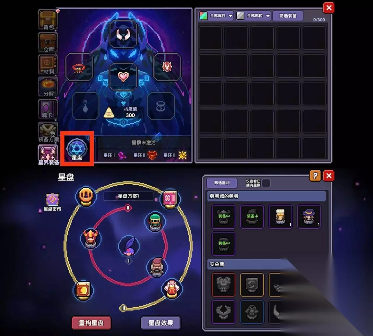 然后点背包—左侧下方 星界装备,将右侧四件装备全穿上——然后左下角点星盘,进去摆放,如图所示即可。