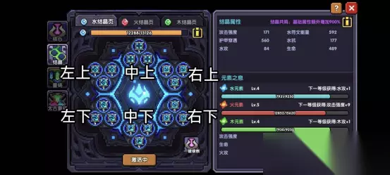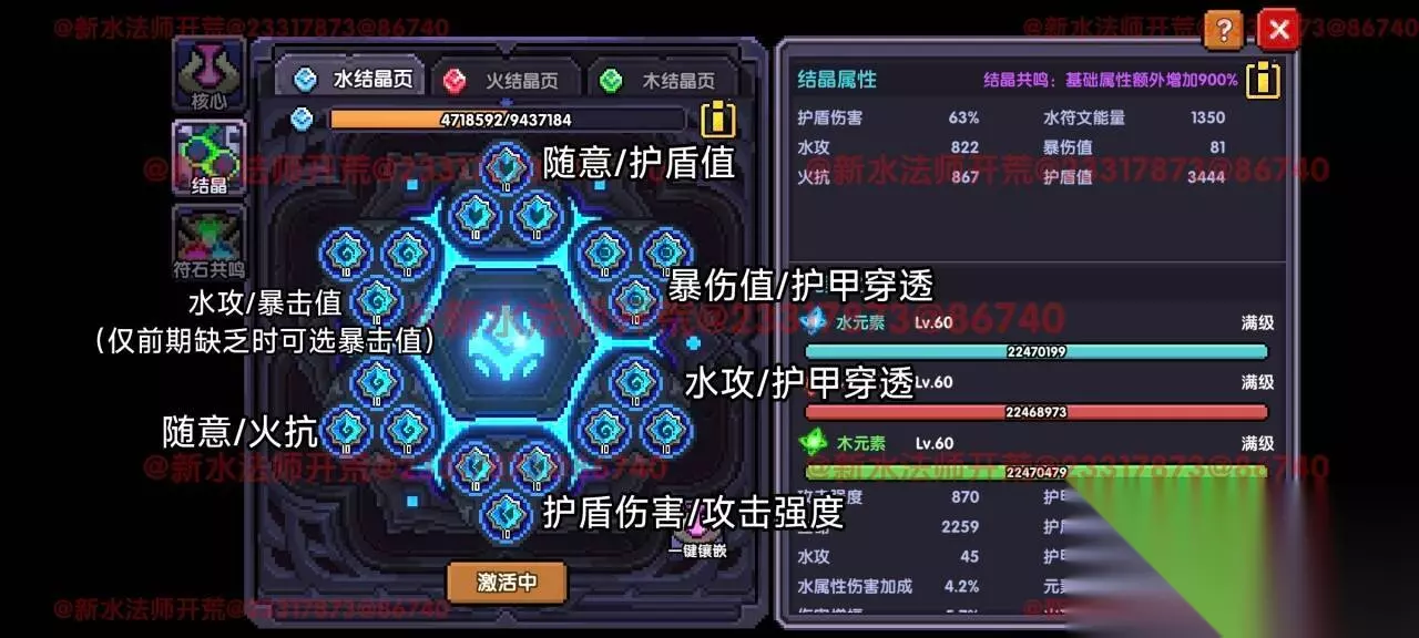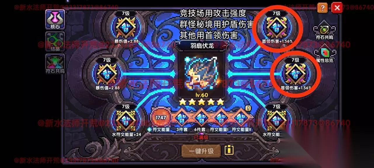 最后是符文结晶。符文结晶点击一键镶嵌后,要记得手动调整。 一键镶嵌的逻辑是从中间最上面那个区域开始,逆时针填充升级。所以我们需要做: 调整右侧两个区域,共6个模块的结晶为护甲穿透; 将中上,左下两个区域高等级的结晶降级,然后移给右侧两区域的护甲穿透升级; 中下区域,在你打不过BOSS的时候,可以更换为护盾伤害