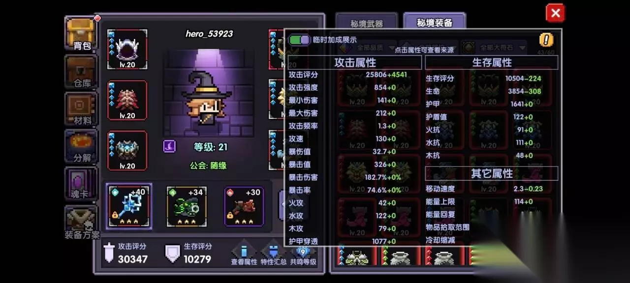 小秘境第9层,解锁天赋系统。 装备“冒险家”即可,我们将其升满星。在五十层后解锁资源副本,使用体力扫荡获取资源,则可以获得更高等级和更多天赋,选择冒险家+能量上限/能量回复+巡猎/火灵/木灵/水灵带满4格(同样升满星,材料是够的) 小秘境第10-12层,解锁宠物和大秘境。 宠物用他送你的两只紫色的即可,优先给奥义宠物升级升星(因为可以获得护甲穿透属性) 大秘境层数进度推荐大概按照60%×小秘境层数这样。 【10层】冲层大礼包给予:勇者契约×1(提供300钻石、双倍经验等内容) 一路推到小秘境20层,大秘境16层 目前大秘境也有跳关机制,三星通过后即解锁后五层,也就是我们只需要打1、6、11、16即可,这样我们就能在不消耗体力的情况下,穿上一身红品暗金了(仅为过渡) 【15层】冲层大礼包给予:神秘技能币(技能币可以留着,攒30个,100层后直接抽新木的传送技能,如果等阶奖励完不成,可以考虑抽普通的技能币) 【20层】冲层大礼包给予:3星圣剑(留着50-120层给新水武器使用) 另外记得在主城左下角,阿兔学堂选择自己当前使用的流派。