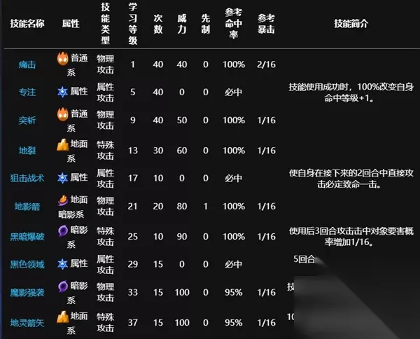 2. 防御:85 3. 特攻:80 4. 特防:92 5. 速度:112 6. 体力:124 7. 总能力:613 二、技能分类 伊泽尔的技能分为三类: 1. 基础技能:在角色培养界面解锁,随着等级提升逐步解锁。 - 痛击:普通攻击,无特殊效果。 - 突斩:物理攻击,同样无额外效果。 - 地影箭:再次使用普通攻击,可造成一定伤害。 2. 元素技能: - 专注:属性攻击,提高命中率和对战伤害,具有属性强化效果。 - 狙击战术:进一步增强元素攻击,可能触发属性加成。 3. 刻印技能(可选): - 刻印系统下的技能,通过特定刻印提升角色能力或改变技能特性。 三、技能使用技巧 • 对于战斗策略,合理运用属性技能能有效提升战斗效率。 • 刻印技能的选择要根据对手和自己的战术来决定,以最大化输出或应对策略。 四、实战建议 • 练习基础技能的连招,利用地影箭制造连击。 • 根据对手的属性选择合适的元素技能,例如对抗火属性时使用水元素技能。 • 不断提升刻印等级,解锁更强的技能组合。 总之,熟悉并灵活运用伊泽尔的技能是赢得战斗的关键。希望这份攻略能帮助你在赛尔号的旅程中取得胜利!