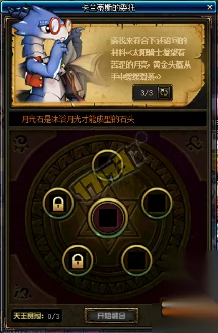 比如上面这句“太阳骑士凝望着苦涩的月亮,黄金头盔从手中缓缓滑落。”指的就是太阳石、月光石和黄金碎片,把这三个石头放进去就可以合成了。 当然你要实在看不懂可以刷新,每天也只能刷三次……