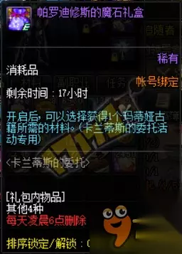 通关推荐地下城可获得1个帕罗迪修斯的魔石礼盒,通关帕罗迪修斯地下城可获得2个。