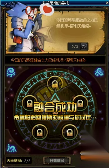 合成成功就可以获得奖励,每天只能合成三次 第一次合成需要三种石头,奖励任务材料1个。 第二次合成需要四种石头,奖励任务材料2个。 第三次合成需要五种石头,奖励任务材料3个,最后这次基本每种都丢一个上去就解决了= =。 也就是每天只能获得6个信义的凭证。