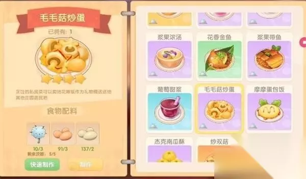 材料获取: 毛毛菇炒蛋材料的获得方式上,毛毛菇只在下雨天刷新,且只在浆果丛林、阳光牧场以及开心农场分布; 鸡蛋可在14级时解锁家禽小屋,在家禽小屋中饲养小鸡来获得; 在牧场商店中购买鸭子,饲养来获得鸭蛋。