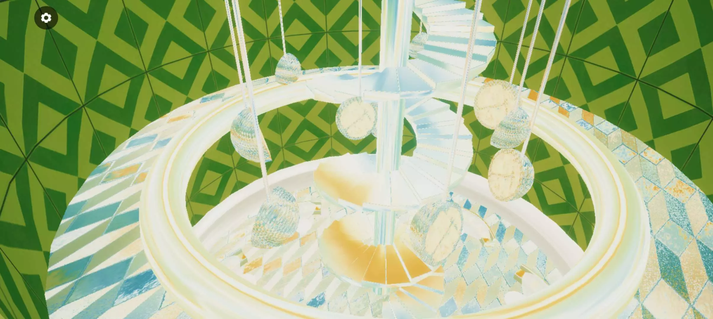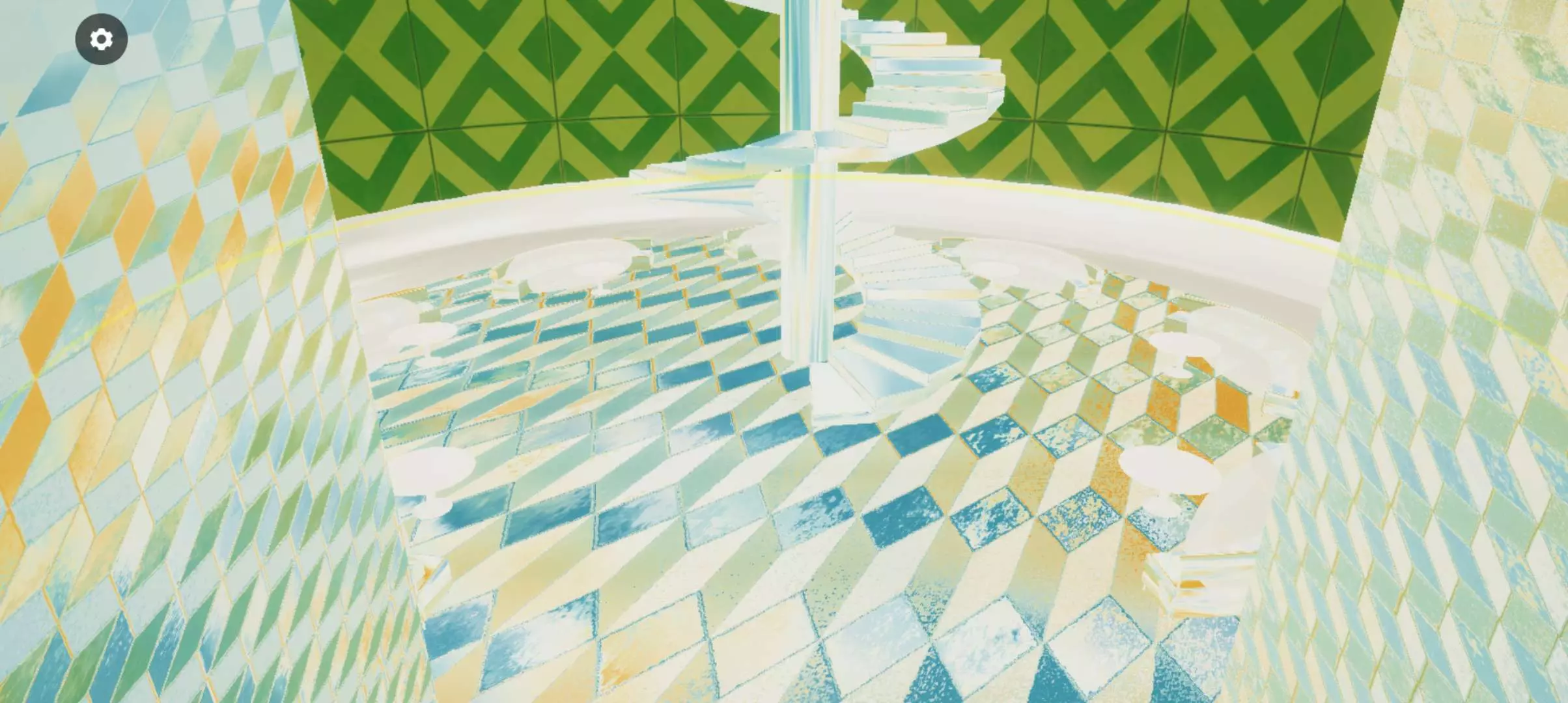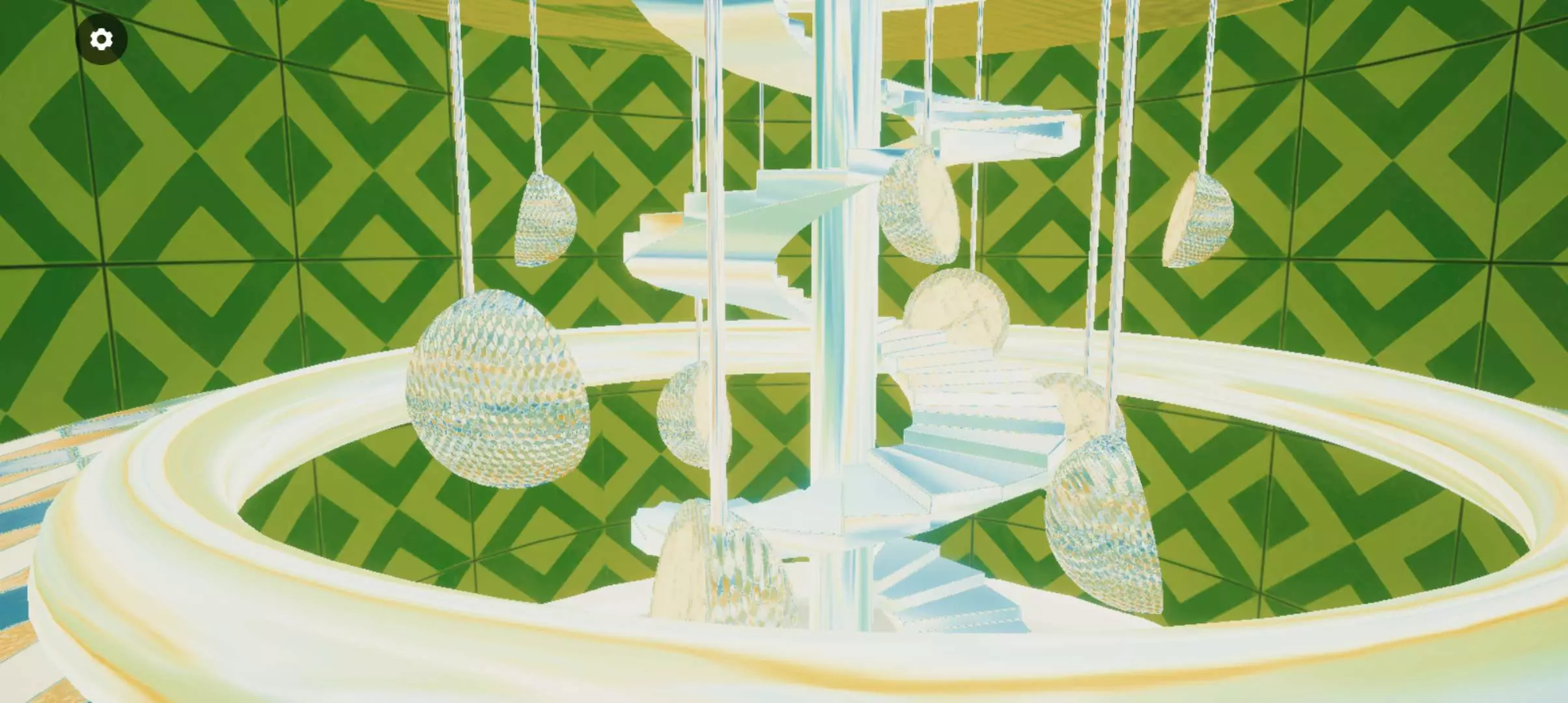 一楼的天花板上安装了带有青柠色调流光效果的吊灯,夹层区域可供观景🌿🔆⑉⑉.墙壁则采用了四方花纹的设计◻️⬜✓