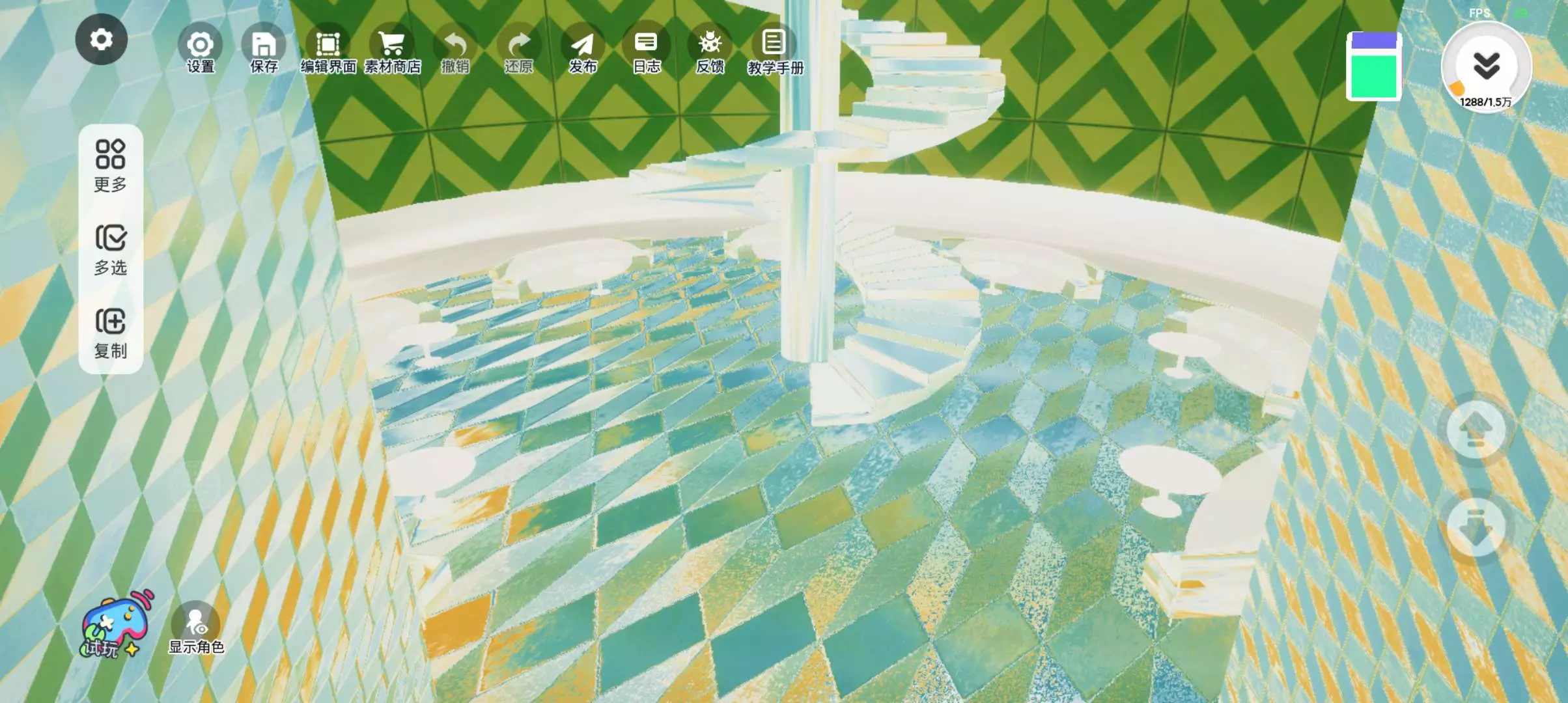 在青柠汽水主题的房屋内🧃✓我铺设了晶莹剔透的玻璃碎质感地板,四周摆放着沙发与桌子,中间的楼梯同样带有亮眼的光泽✨🔆🌕