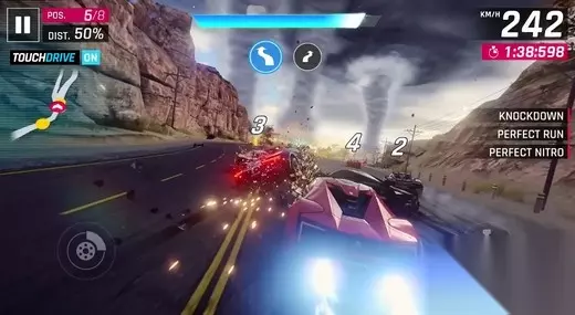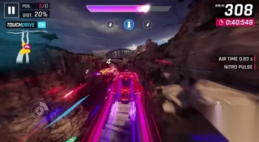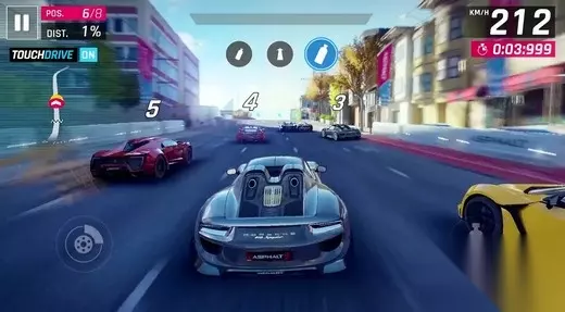 ▌从“手动挡”到“自动挡” 简化操作,但不失竞技体验 竞速游戏最大的魅力之一在于沉浸感和真实感,在赛车游戏中,通过自己的手动操作在赛道上驰骋,每过一个弯道、每上下一个坡道,犹如是在现实赛道上飙车。在《狂野飙车8》中,为了更加贴近真实的赛车,游戏提供了重力操控和虚拟按键操控两种主要驾驶模式来考验玩家在飘逸和车辆竞逐时的驾驶水平。 而在《狂野飙车9》中,Gameloft使用了全新驾驶方法TouchDrive,也就是自动驾驶,玩家的可操作范围也就被机械的规范到了左右车道的选择、漂移和氮气加速手动操作这三个功能上来,甚至可以全程不点击屏幕任何一点,车辆也可以自行完成驾驶任务直至终点。这一变化,非常适合喜欢竞速、又不太会操作的玩家。
