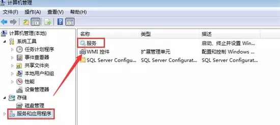 2、进入计算机管理界面后,展开左侧的“服务和应用程序”,鼠标点击“服务”。