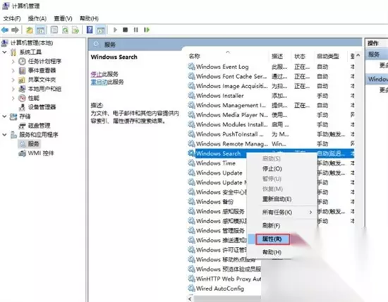 3、找到“Windows search”并右键点击“属性”打开。