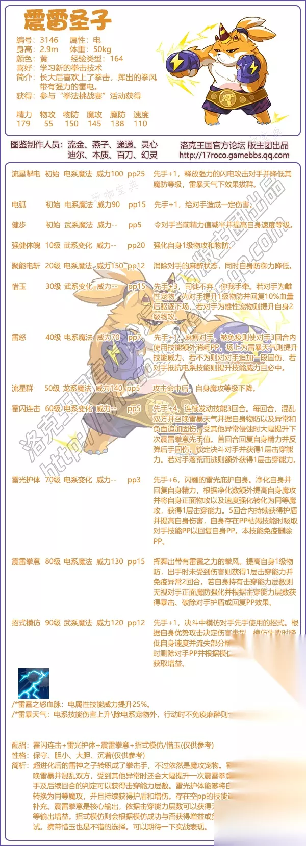 洛克王国震雷圣子获取方法 震雷圣子(雷神之子超进化) 系列:地下宫殿 种族值:777 属性:电 魔攻宠,非专属血脉➕四专属技能 获取方法:参与“拳法挑战赛”活动获得